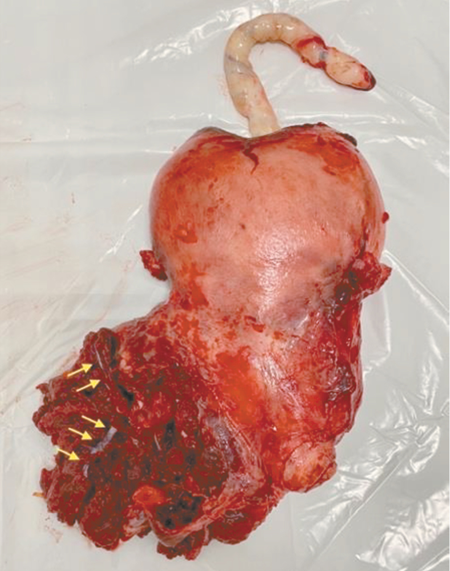 Рис. 4. Макропрепарат матки с врастанием плаценты в параметрий (стрелками указаны мощные сосудистые структуры)
