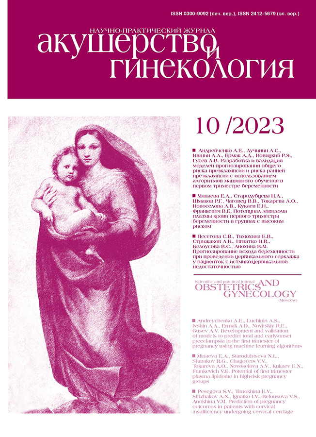 Заключение: Метрики полученных итоговых моделей соответствовали опубликованным ранее аналогам. Результаты внешней валидации показали относительную устойчивость моделей к новым данным, что в совокупности с показателями качества предполагает возможность их использования в реальной клинической практике. Это наш первый опыт прогнозирования сложного по механизму развития осложнения беременности на основе данных реальной клинической практики. Качество прогностической модели напрямую зависит от используемых данных и статистических алгоритмов, которые нам предстоит улучшить в будущих исследованиях.