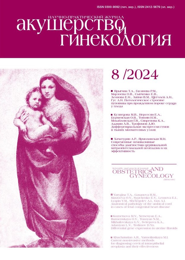 Заключение: Полученные данные позволяют выделить в исследованной выборке два молекулярных фенотипа миомы матки – ассоциированный и не ассоциированный с соматической мутацией во втором экзоне гена MED12. При разных молекулярных фенотипах миомы матки экспрессия некоторых генов в миоматозных узлах меняется разнонаправленно, и статистически значимые отличия выявляются не только между каждым типом миомы и миометрием, но и между миомами разных молекулярных фенотипов. Полученные результаты позволяют рассматривать часть исследованных генов в качестве потенциальных мишеней для разработки персонализированных подходов к диагностике, прогнозированию течения, профилактике и лечению миомы матки.