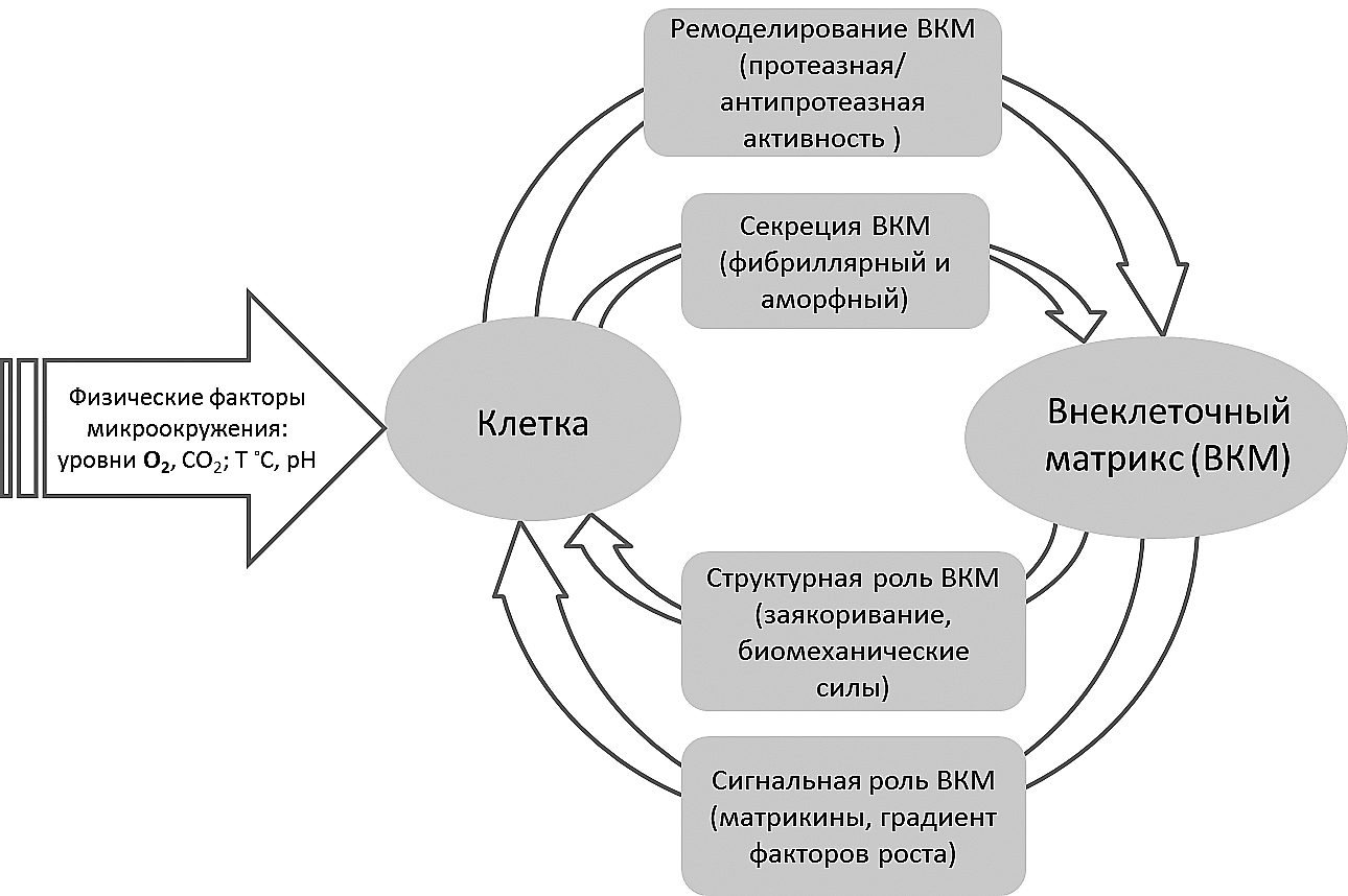 К настоящему времени убедительно показано, что взаимодействие компонентов ВКM создает структурный каркас тканей через сеть взаимодействий, приводящих к образованию макромолекулярных комплексов, таких как коллагеновые фибриллы и эластические волокна. Эти структуры не только обеспечивают механическую опору, но и вовлекаются во взаимодействие с клетками, регулируя их рост и поведение. Эти контакты реализуются по принципу обратной связи (рис. 1) [27, 45]. Клетки производят, секретируют, запасают и ремоделируют ВКM, адаптируя состав и топографию к конкретным условиям микроокружения. ВКM, в свою очередь, передает сигналы клеткам [44]. Такой механизм обратной связи необходим для быстрой реакции клеток на изменения окружающей среды. Эффекты ВКМ могут быть по-разному реализованы. ВКМ способен напрямую связывать различные типы рецепторов клеточной поверхности, тем самым опосредуя закрепление клеток и регулируя пути, участвующие во внутриклеточной передаче сигналов и механотрансдукции. Кроме того, ВКМ может действовать за счет неканонического представления факторов роста и других биологически активных медиаторов, а также высвобождать в результате ограниченного протеолиза функциональные фрагменты – матрикины.