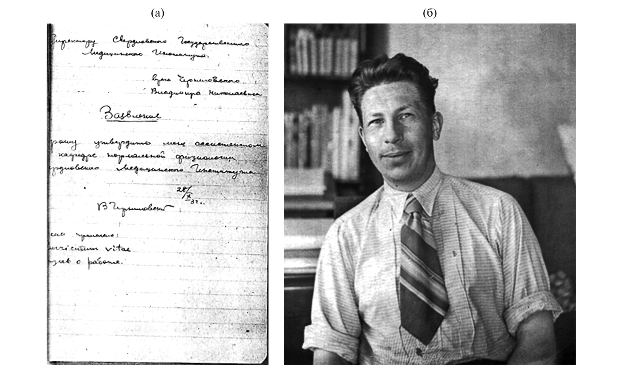Рис. 2. Будущий академик В.Н. Черниговский в начальный период его научной карьеры: а – заявление В.Н. Черниговского на должность ассистента каф. нормальной физиологии Свердловского государственного медицинского института; б – В.Н. Черниговский в молодости.