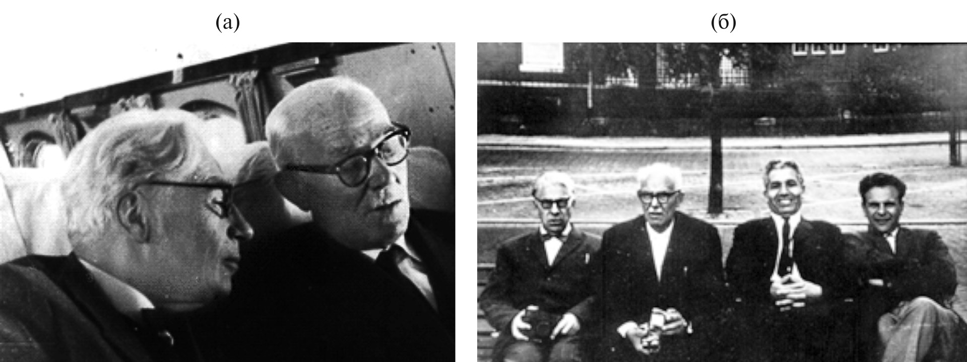 Рис. 3. Дружба длиной в жизнь: а – академики В.Н. Черниговский и В.В. Парин за беседой в салоне самолета; б – академик В.Н. Черниговский, академик В.В. Парин, чл.-корр. Э.С. Асратян, академик П.Г. Костюк (слева направо).