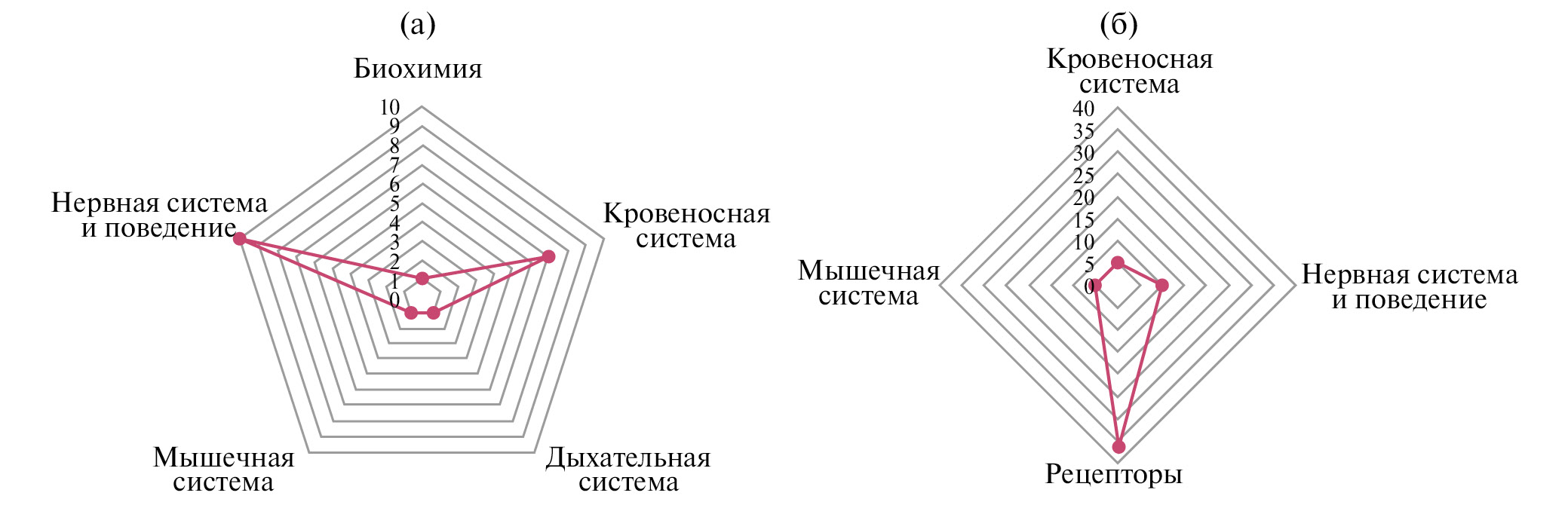 Рис. 4. Количество научных статей В.Н. Черниговского по различным областям физиологии: а – количество статей с 1935 по 1939 год включительно; б – количество статей с 1940 по 1948 года включительно. Радиусы диаграммы соответствуют областям физиологии; т – точки в диаграмме отражает общее количество статей в этой области. Шаг в диаграмме (а) соответствует одной публикации, в диаграмме (б) – пяти публикациям.