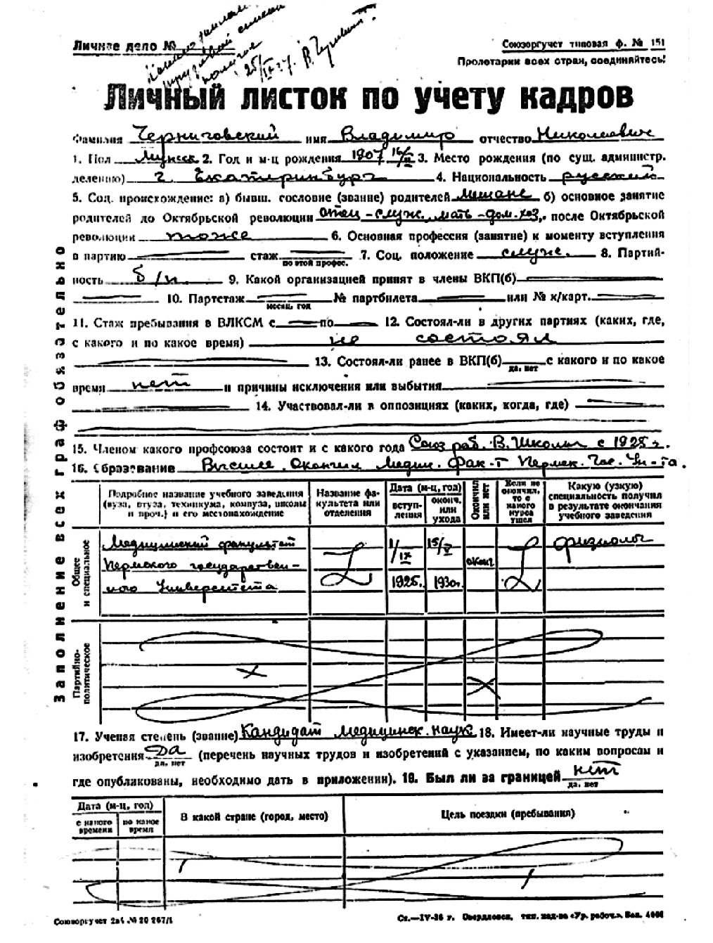 Рис. 7. Личный листок по учту кадров, заполненный В.Н. Черниговским.