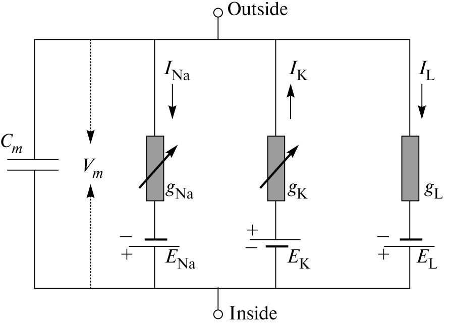 С электрической точки зрения, по Ходжкину и Хаксли [61], мембрана гигантского аксона кальмара представляет собой электрическую емкость, соединенную параллельно с проводящими элементам (проводимостями) и источниками тока (электрическими батареями), которые являются электрическими эквивалентами электрохимического потенциала (рис. 6).