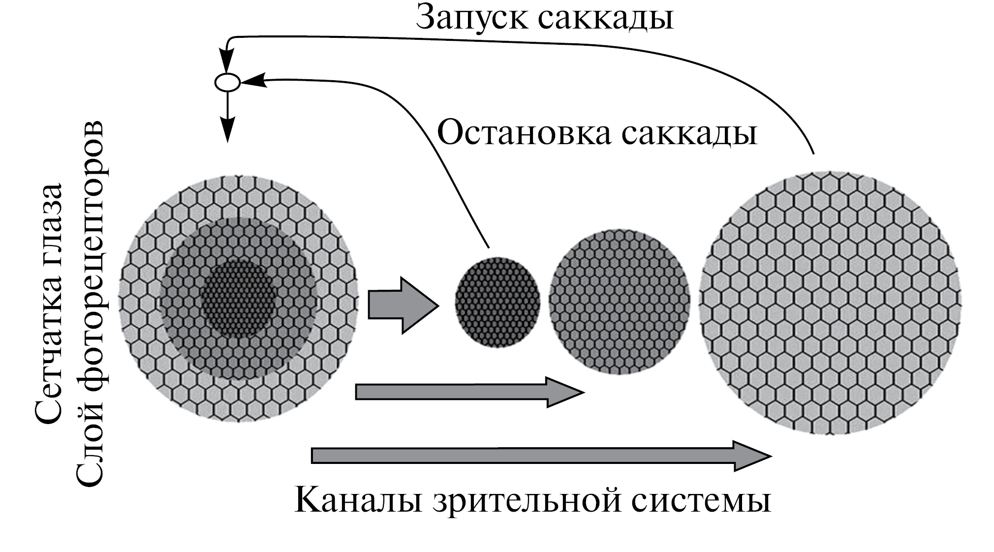 Для того, чтобы был правильно указан вектор направления фовеации, т.е. указано направление перевода взора, необходимо передать эту информацию о представительстве данной точки в первичном поточечном описании. Эта информация должна быть передана из наружного коленчатого тела (НКТ) в верхние бугры четверохолмия (ВБЧ). Следует указать и направление вектора, и его величину для наведения глаза на цель. Такой сигнал подается из НКТ в ВБЧ [36, 38]. Очень похоже, но более сложно организована теменная кора, участвующая в прогнозировании и обеспечении произвольного движения глаз [110]. На рис. 3 представлена упрощенная схема управления движениями глаз: от слоя пирамиды с крупными рецептивными полями и перекрывающего периферию поля зрения поступает сигнал, запускающий саккады, а от слоя с мелкими рецептивными полями сигнал остановки движения глаз. Иными словами, при чтении как обычного текста, так и текста, размытого вейвлетной фильтрацией, именно магноцеллюлярная (крупноклеточная, пространственно низкочастотная и быстро проводящая) система определяет стратегию движений глаз. Если соотнести полученные нами данные о взаимодействии магно- и парвоканалов зрительной системы с размерами и геометрией фовеа, становятся понятными закономерности окуломоторной активности при чтении [27, 28]. Область парафовеа, выделяющая низкочастотную информацию и передаваемую корупноклеточным (магно) каналом, “запускает” движения глаз. Периферия поля зрения запускает бросок глаза вдоль строки на необходимый угол, а “включение” фовеа на заданном повороте глаза высокочастотной пространственной чувствительности глаза, присущая элементам фовеа, дает сигнал остановки. В начале броска происходит подавление активности парвосистемы, поэтому нет ощущения смазывания изображения [27, 28, 65—67].