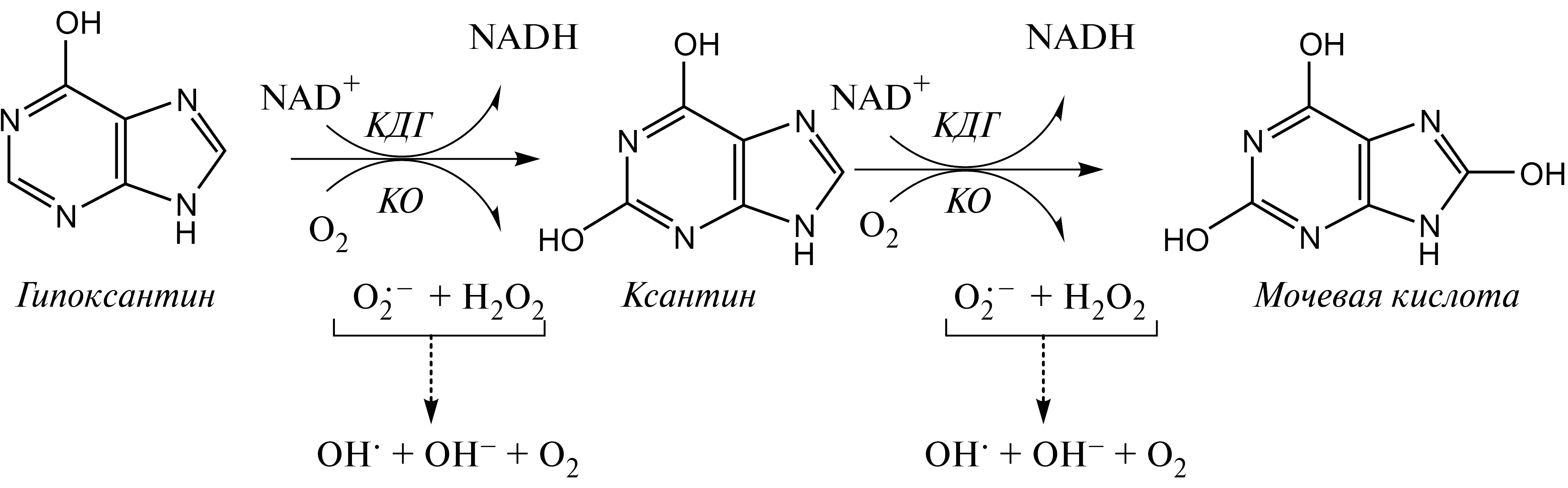 В физиологических условиях у млекопитающих энзим синтезируется и находится преимущественно в форме КДГ или NAD+-оксидоредуктазы, предпочитающей NAD+ в качестве акцептора электронов. Однако эта форма КОР может обратимо или необратимо переходить в КО или О2-оксидоредуктазу, которая в качестве акцептора электронов использует кислород [30]. В первом случае электроны, образующиеся в результате окисления гипоксантина или ксантина, восстанавливают NАD+ до NАDН. Во втором случае электроны передаются непосредственно молекулярному кислороду с образованием супероксида и, во вторую очередь, пероксида водорода [27]. Схема реакции, катализируемой ферментом, представлена на рис. 2.