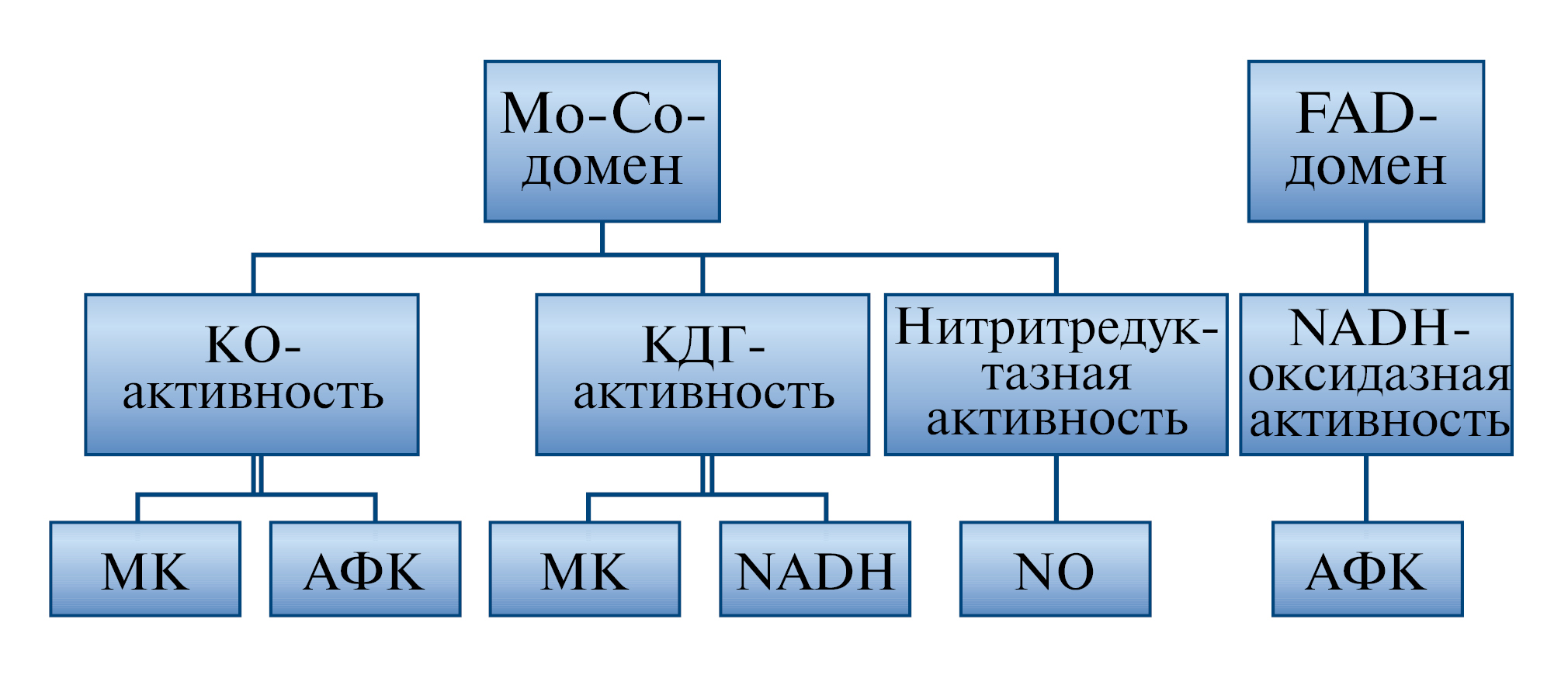 Таким образом, продуктами деятельности КОР являются: МК и восстановленный никотинамидадениндинуклеотид (NADH) в результате КДГ-активности; МК и АФК в результате КО-активности; активные формы азота (АФА) и NO в результате нитрат- и нитритредуктазной активности; и АФК в результате NADH-оксидазной активности энзима [8]. КО- и КДГ-активность, а также нитратредуктазную активность фермента обеспечивает Mo-Co-домен; NADH-оксидазную активность – FAD-домен. Действия КОР схематически представлены на рис. 3.