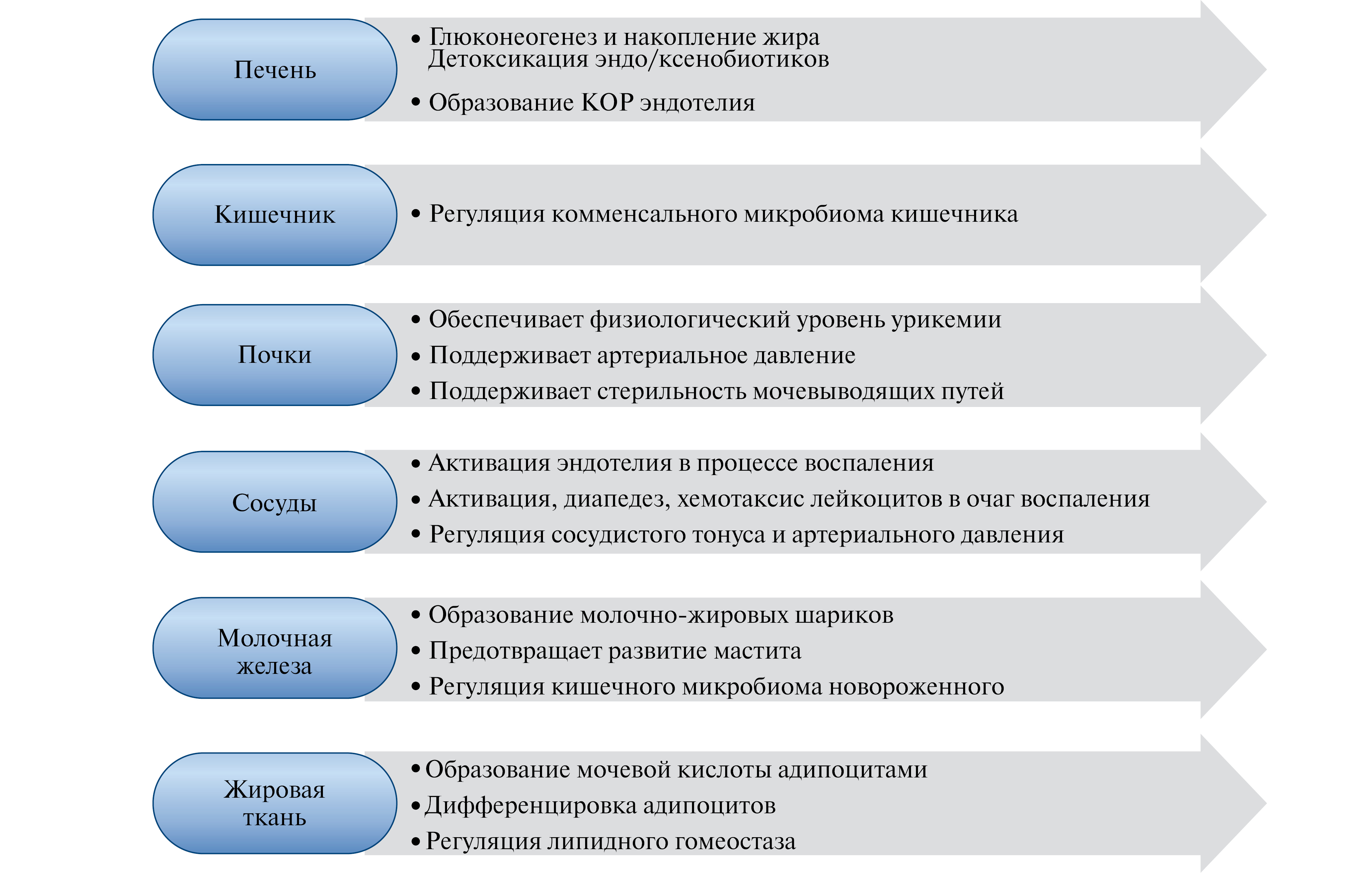 Жировая ткань. Считается, что МК в основном вырабатывается в печени и выводится почками через мочевыводящие пути. В то же время ряд исследований, проведенных в последние годы, показал, что в жировой ткани КОР присутствует в большом количестве и имеет высокую активность. КОР адипоцитов также способна продуцировать МК. При этом уровень гиперурикемии тесно связан с накоплением висцерального жира и не зависит от подкожного жира [57]. Кроме того, K.J. Cheung и соавторы сообщили, что КОР играет роль в дифференцировке адипоцитов [18]. Это дает основание предполагать участие КОР в липидном гомеостазе.