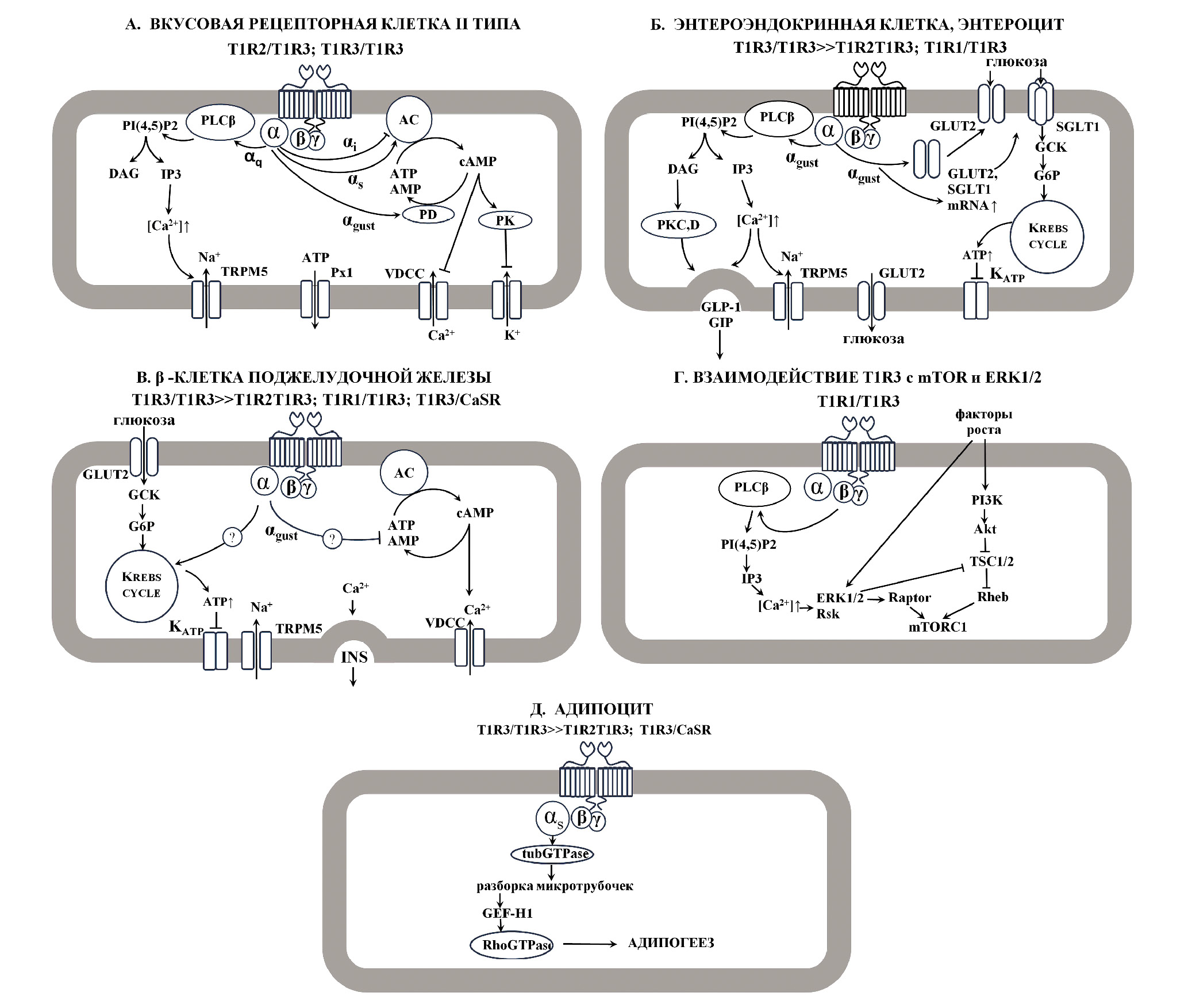 Вклад канонического внутриклеточного T1R-зависимого сигнального каскада в регуляцию секреции инсулина в β-клетках не выяснен. Однако показано, что активация T1R3 приводит к увеличению продукции АТФ в митохондриях [73, 108], а нокаут TRPM5 сокращает выброс инсулина, вызванный аппликацией глюкозы [26]. В культуре мышиных панкреатических клеток MIN6 Nakagawa и соавт. [107] обнаружили низкий уровень экспрессии связанного с T1R рецепторами G-белка α-гастдуцина. При этом нокаут α-гастдуцина не влиял на повышение внутриклеточной концентрации Ca2+ под действием некалорийных сахарозаменителей. Сравнительно недавно для другой INS-1 линии крысиных панкреатических β-клеток установили, что нокаут α-гастдуцина приводит к значительному увеличению концентрации цАМФ и Ca2+ вместе с базальным уровнем инсулина. Причины расхождений экспериментальных результатов, кроме видовых различий, все еще не установлены. Также не ясно, с каким именно мембранным рецептором в этих моделях связан α-гастдуцин, хотя сделано предположение о его взаимодействии с рецепторами аминокислот и жирных кислот [153].