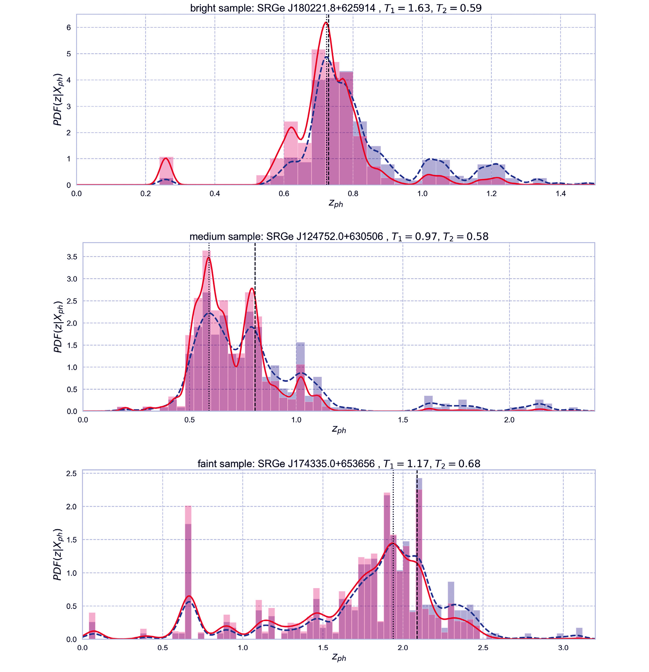 На рис. 6 приведены примеры вероятностных прогнозов PDF(z), сделанных моделями SRGz для трех рентгеновских источников eRosita-1%DESI-East (случайно взятых из выборок “bright”, “medium” и “faint”). Эмпирическое распределение PS(z) показано в виде гистограммы голубого цвета (с шагом ∆zbin = 0.04), PKDE(z) – штриховая синяя линия на графиках. Калиброванные эмпирические распределения PS(z) показаны в виде гистограмм красного цвета, калиброванные функции ядерной оценки плотности распределения PKDE(z) показаны сплошной красной линией на графиках. Параметры модели двух-температурной калибровки подписаны в заголовке графиков. Вертикальные пунктирная и штриховая линии обозначают точечный прогноз фотометрического красного смещения (zph) и спектральное красное смещение (zph) объекта соответственно. На верхнем графике фотометрическое красное смещение объекта очень хорошо согласуется с результатом спектроскопических измерений. Два других источника демонстрируют расхождения между измерениями zph и zsp. Наибольшее расхождение между фотометрическим и спектральным измерением демонстрирует объект на средней панели рис. 5.1. Также здесь хорошо виден мультимодальный характер прогнозов photo-z рентгеновских квазаров по выбранной системе широкополосных фильтров: PDF(z) имеет в этом случае несколько пиков, одному (наиболее вероятному) из которых следует прогноз photo-z, в другом лежит спектральное измерение красного смещения.