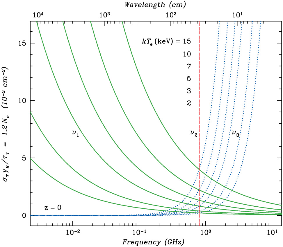 Зависимость от параметров газа. Очевидно, что важнейшей характеристикой скопления с точки зрения его регистрации на картах фона как радиоисточника и идентификации физического процесса, ответственного за его появление, служит диапазон частот ν1 ν ν3, где в излучении скопления доминирует тормозное радиоизлучение межгалактического газа. Нижняя граница этого диапазона ν1 – частота, левее которой усиление яркости фонового радиоизлучения из-за комптоновского рассеяния на электронах горячего газа скопления превышает поток его тормозного излучения. Верхняя граница ν3 – частота, правее которой поток тормозного излучения газа уже не может компенсировать понижение яркости микроволнового фонового излучения. Как рассчитать эти критические частоты, объяснено выше в абзаце, следующем за уравнением (7).
