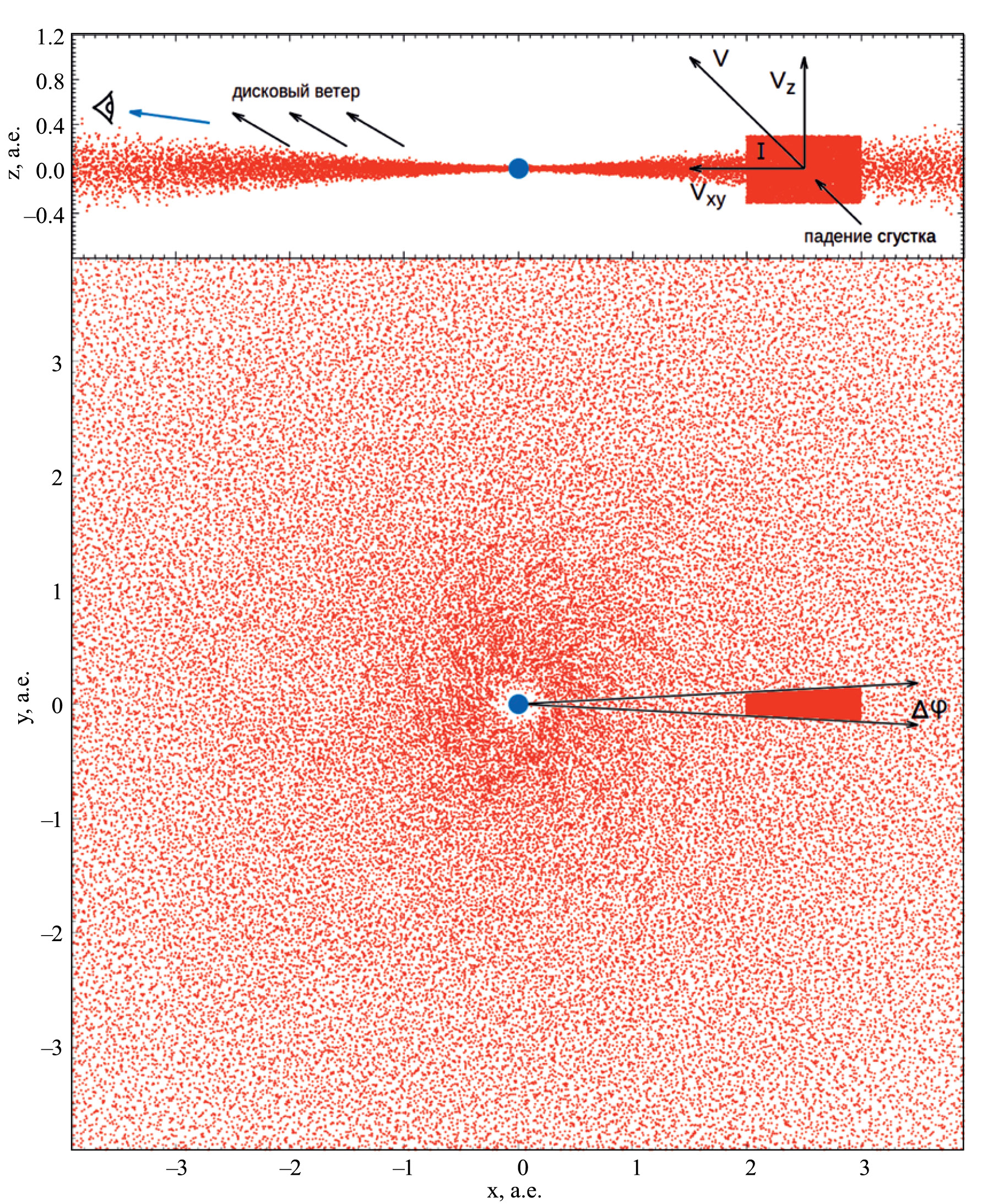 Рис. 1. Вверху показано сечение диска в плоскости после добавления одной порции вещества сгустка. Внизу – проекция положения частиц газа на плоскость для модели , а.е., а.е., , ,