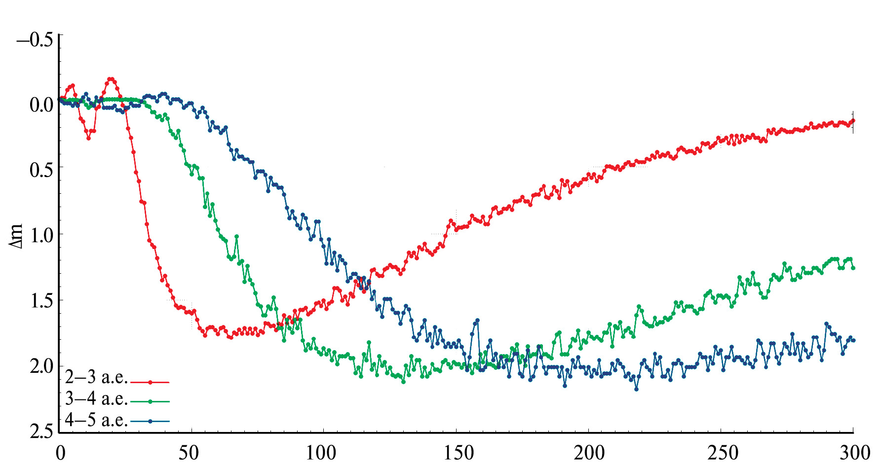 Теоретические кривые блеска показаны на рис. 3–5. Видно, что с уменьшением расстояния между возмущением и звездой блеск убывает быстрее, а фаза минимума становится короче (рис. 3). Похожим образом на кривую блеска влияет уменьшение параметра L (рис. 4) и увеличение угла падения I (рис. 5). Расчеты показали, что вариации параметра в пределах – не оказывают заметного влияния на поведение кривой блеска.