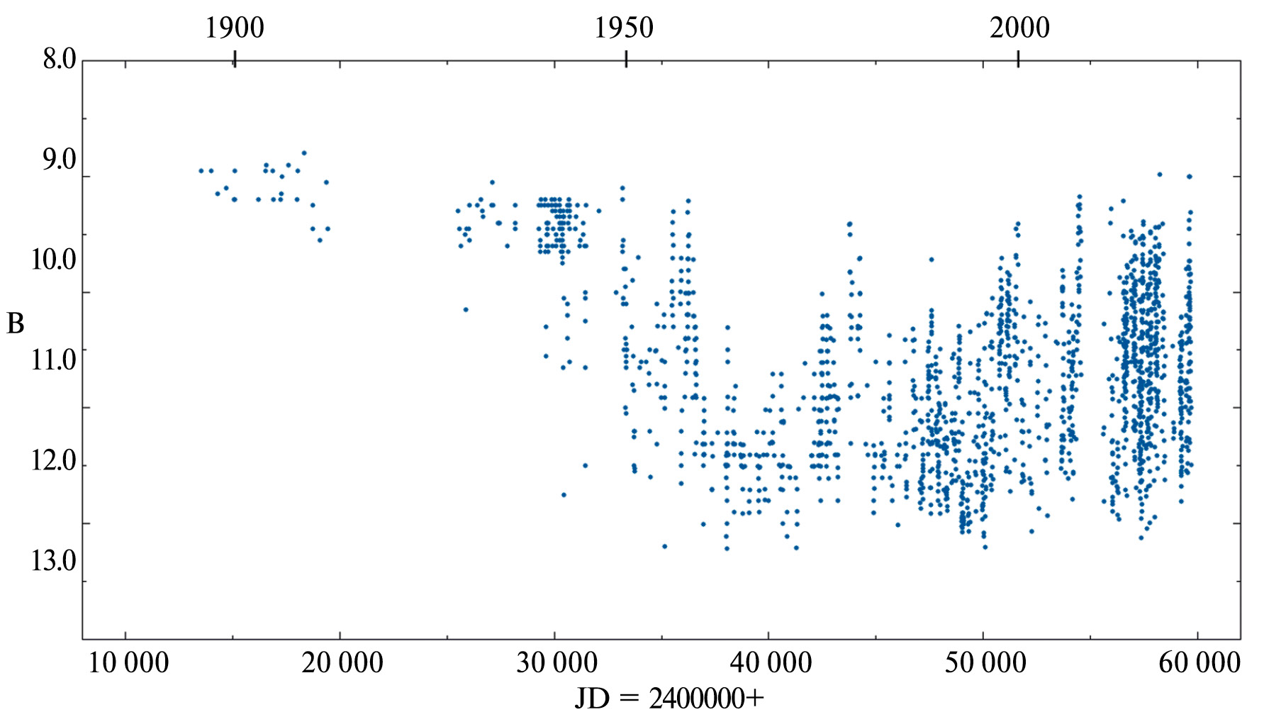 Рис. 6. Историческая кривая блеска CQ Tau в полосе B по данным (Гринин и др., 2023).