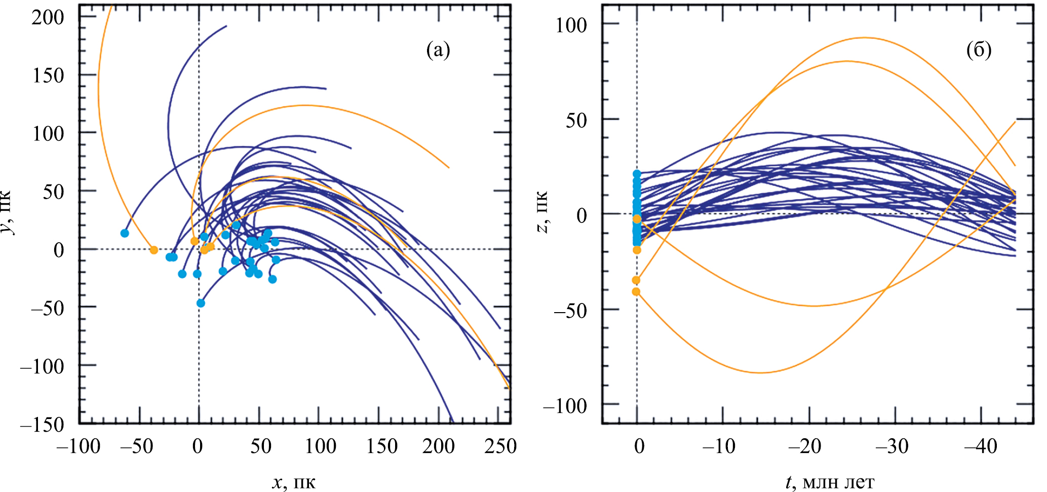 Рис. 1. Распределение 31 члена движущейся группы Pictoris в проекции на галактическую плоскость и их траектории в прошлом (a), вертикальное распределение этих звезд и их траектории в прошлом (б), траектории прослежены на интервале 45 млн лет, оранжевым цветом отмечены траектории четырех звезд, отброшенных при вычислении кинематического центра этой звездной группировки. Все данные для этих звезд были взяты нами из каталога Gaia DR3.