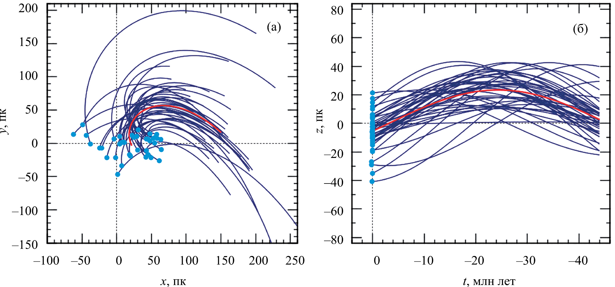 Рис. 3. Распределение 41 члена движущейся группы Pictoris в проекции на галактическую плоскость и их траектории в прошлом (a), вертикальное распределение этих звезд и их траектории в прошлом (б), траектории прослежены на интервале 45 млн лет, траектория кинематического центра этой звездной группировки показана красным цветом. Значения лучевых скоростей этих звезд были взяты нами из электронной базы SIMBAD.