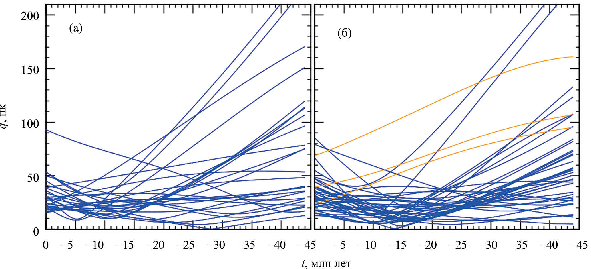 Рис. 4. Отклонения звезд от средней траектории (параметр ) на интервале интегрирования для 27 звезд движущейся группы Pictoris с лучевыми скоростями из каталога Gaia DR3 (а) и для 41 звезды этой группы с лучевыми скоростями из электронной базы SIMBAD (б), желтым цветом на панели (б) отмечены траектории трех звезд, которые не были использованы при оценивании возраста группы.