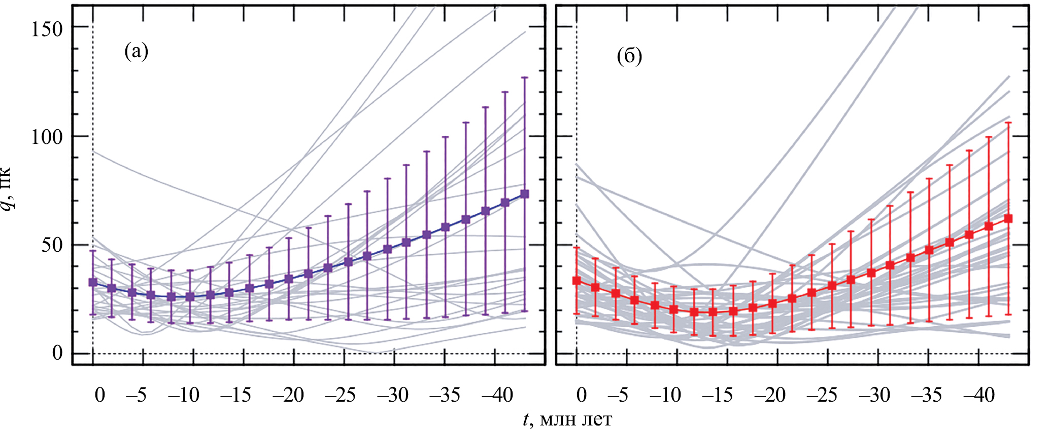 Рис. 5 фактически повторяет рис. 4 за исключением того, что на обеих панелях рисунка даны сглаженные средние. При этом хорошо видно, что а) размер звездной группировки 30–40 млн лет в прошлом имел существенно больший пространственный размер по сравнению с настоящим, б) имеется минимум средней линии на каждой панели, хотя минимум более глубокий на панели рис. 5б, в) имеется тенденция к расширению звездной группировки. Отметим, что на рис. 5б орбиты звезд были вычислены относительно новой траектории кинематического центра, вычисленной после исключения отскоков. Анализ 27 звезд с лучевыми скоростями из каталога Gaia DR3 (рис. 5а) дал следующую оценку возраста движущейся группы Pictoris: