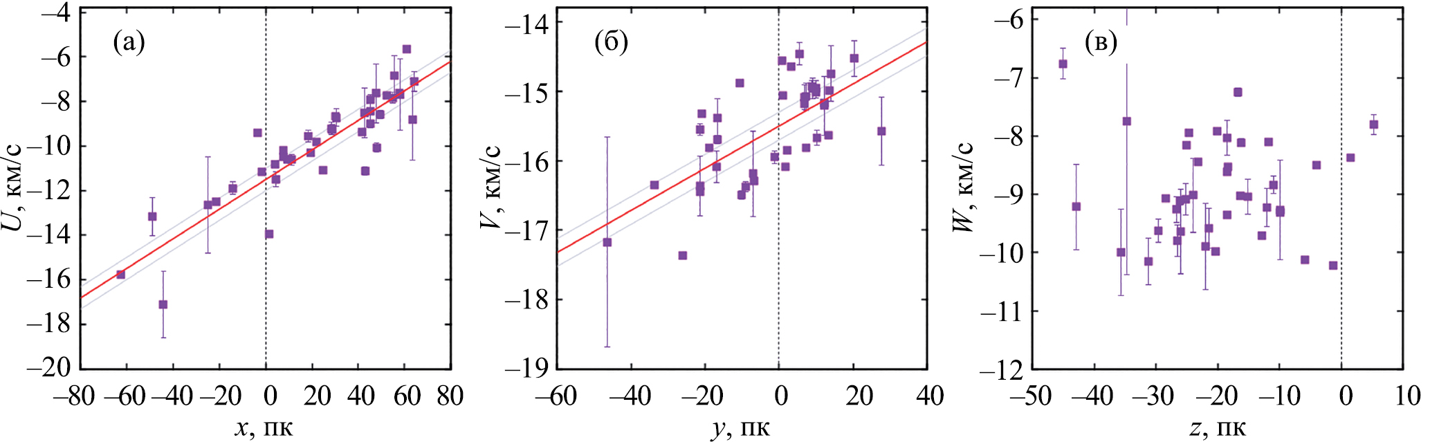 На рис. 6 даны: зависимость скоростей от координаты , где показан найденный методом наименьших квадратов на основе этих данных градиент км/с/кпк с границами доверительных интервалов; зависимость скоростей от и градиент км/с/кпк, а также зависимость скоростей от . Фактически по данным трех представленных на рисунке панелей имеем возможность определить три градиента, которые в линейной модели Огородникова–Милна (Огородников, 1965; Бобылев, Байкова, 2023) являются диагональными членами матрицы деформации и описывают эффекты расширения звездной системы.