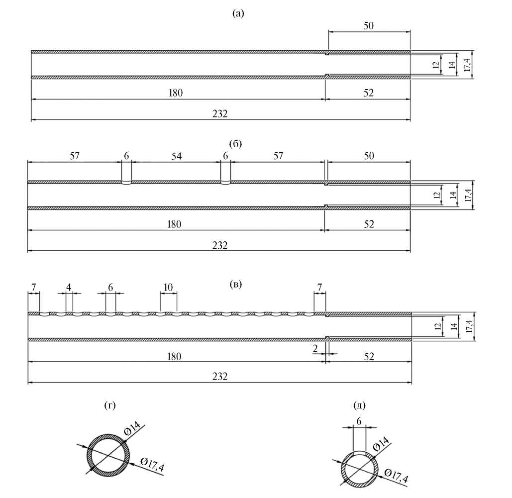 Рис. 2. Продольные и поперечные разрезы: (а, г) – образца цилиндрической трубки без боковых отверстий, (б, д) – образцов интерференционной антенны с двумя боковыми отверстиями, (в, д) – семнадцатью боковыми отверстиями.