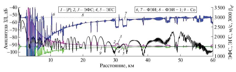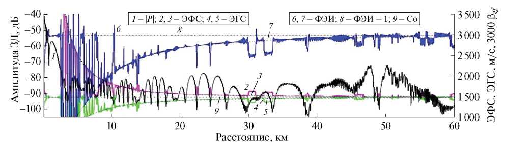 Рис. 1. 1 – Амплитуда ЗД, 2 – ЭФС, 3 – лучевая аппроксимация ЭФС, 4 – ЭГС, 5 – лучевая аппроксимация ЭГС, 6 – 3000βef, 7 – лучевая аппроксимация 3000β*ef, 8 – уровень 3000βef = 3000 или βef = 1, 9 – c0 = 1500 м/с; f = 345 Гц, r = 0.01–5.6 км, zs = 15 м, zr = 20 м, h = 3417 м, c0 = 1500 м/с. Идеальный волновод.