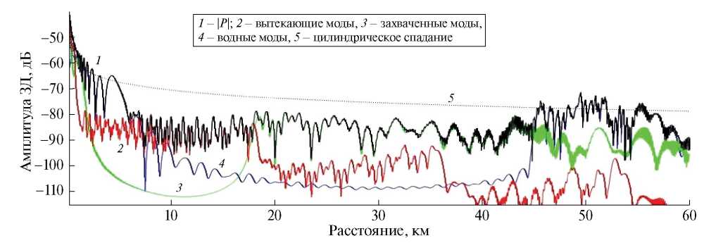 Рис. 5. 1 – Амплитуда звукового давления и составляющие: 2 – вытекающие моды, 3 – захваченные моды, 4 – водные моды, 5 – цилиндрическое спадание. Северная Атлантика, июнь, f = 340 Гц, zs = 105 м, z = 155 м, r = 0.1–60 км.