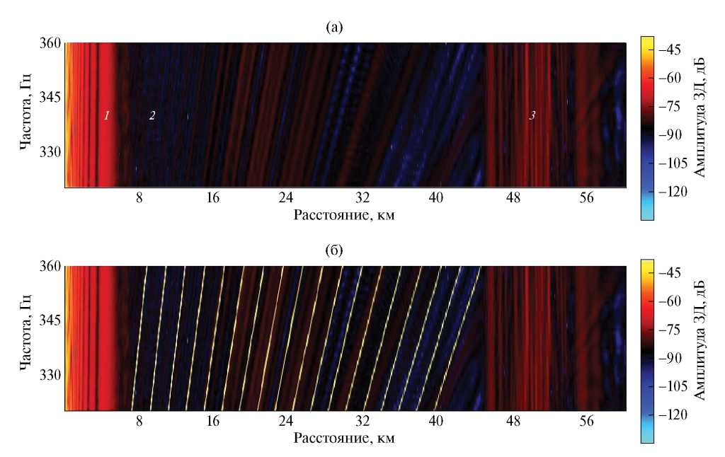 Рис. 7. (а) – Интерферограмма амплитуды звукового давления; Северная Атлантика, июнь, f = 320–360 Гц, zs = 105 м, z = 155 м, r = 0.1–60 км; 1 – БЗАО, 2 – зона тени, 3 – ДЗАО. (б) – Та же интерферограмма со светлыми “контрольными” линиями, наклон которых вычислен по формуле (1), ∂f/∂r = (f/r)β, с подстановкой в качестве β лучевой аппроксимации β*ef = 1/[1 + (2h/r)2] по формуле (9)