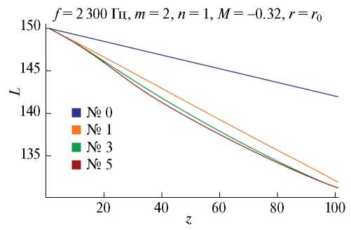 где ζm,n – n-й по порядку корень характеристического уравнения (8) с адмиттансом β0(L0). Данная мода будет иметь некоторое затухание при распространении по каналу, приводящее к снижинию уровня звукового давления в канале. Обозначим через L1(z) = 20lg(pm,n(z)/(2 × 10–5)) вычисленную согласно (9) зависимость уровня звукового давления от осевой координаты на стенках канала. Далее определим адмиттанс β1(L1(z)) вдоль оси канала и определим параметр ε: