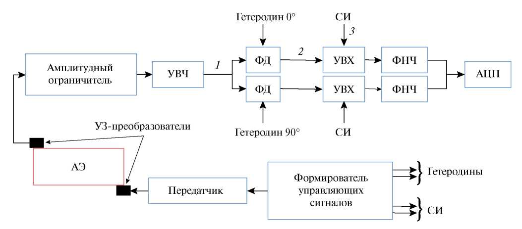 С выходов ФД сигналы поступают в устройства выборки-хранения (УВХ), на которые поступают стробирующие импульсы (СИ). СИ задержаны относительно момента зондирования таким образом, чтобы выделить полезный сигнал с определенным типом волны, прошедший через АЭ. После УВХ сигналы фильтруются, и постоянные напряжения, пропорциональные произведению амплитуды сигнала на косинус сдвига фазы в одном канале и произведению амплитуды и синусу сдвига фазы в другом канале, поступают на входы АЦП (выражения (1) и (2)). Далее производится обработка сигналов в соответствии с (3).