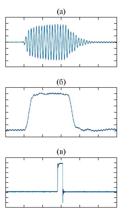 Рис. 2. (а) – Принятый и усиленный радиоимпульс, (б) – видеоимпульс с выхода фазового детектора, (в) – строб-импульс.