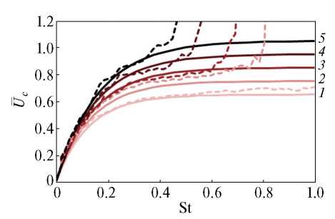 Рис. 3. Зависимость фазовой скорости осесимметричных возмущений (n = 0) от числа Струхаля в различных поперечных сечениях: 1 – = 2; 2 – = 3; 3 – = 4; 4 – = 5; 5 – = 6. Пунктирные линии – эксперимент, сплошные – аппроксимация (8).