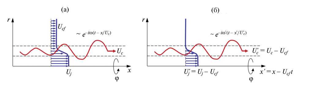 Пусть на фоне среднего течения распространяется возмущение, представляющее собой в направлении х плоскую волну вида, где w – заданная круговая частота, а Uc – скорость распространения волны. В частности, можно считать, что близкую к такой структуру имеют возмущения в виде пакетов волн неустойчивости, если, в рамках локально-однородного приближения, не учитывать осевую эволюцию огибающей пакета в струе. Перейдем в систему отсчета (x', r), x' = x – Ucft, связанную с внешним (спутным) потоком (рис. 6б). Будем обозначать штрихом параметры, относящиеся к системе (x', r). Так, средняя скорость потока U'(r) в новой системе будет соответствовать модели струи, истекающей в неподвижное пространство: U'(r) → 0 при r → ∞. При этом скорость “струи” в новой системе будет меньше, чем в исходной: U'(r) = U'j = Uj – Ucf при r < rc. Легко показать, что возмущения в новой системе отсчета будут иметь вид e–iw'(t–x'/U'c), где U'c = Uc –Ucf, w' = w(1 – k), k = Ucf/Uc (эффект Доплера). Далее, безразмерная скорость возмущений Uc = Uc/Uj в исходной системе отсчета может быть выражена через безразмерную скорость возмущений U'c = U'c/U'j в системе (x', r)