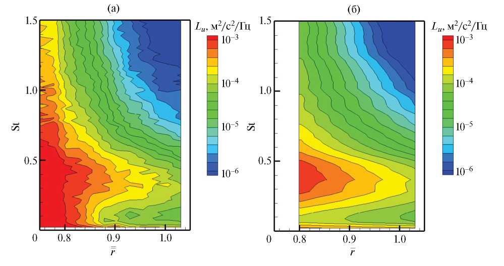 Из сравнения спектров пульсаций в различных точках в данном сечении обращает на себя внимание различный характер спектров внутри и вне слоя смешения. В слое смешения спектр пульсаций имеет вид, характерный для развитого свободного турбулентного потока с примерно постоянным уровнем на низких частотах и спаданием в соответствии с законом “–5/3” в высокочастотной области. Во внешней по отношению к слою смешения зоне и в потенциальном ядре спектр имеет характерный максимум в области чисел Струхаля от 0.1 до 1, соответствующий волнам неустойчивости. В работах [12, 34] данный максимум в спектре и его связь с пакетами волн неустойчивости подробно изучались на примере результатов измерений пульсаций скорости на оси струи. При наличии спутного потока, как видно из рис. 9б, термоанемометр позволяет измерять “след” волновых пакетов и вне струи. На рис. 10–11 показано, что данные измерений в потенциальной зоне подчиняются модели (17), (18) со скоростью конвекции, рассчитанной в соответствии с описанной выше процедурой (рис. 8). На рис. 10а показана измеренная спектральная карта (т. е. зависимость интенсивности пульсаций Lu от r и St) пульсаций скорости внутри струи, а на рис. 10б – спектральная карта, построенная на основе спектра Lu в точке r = 0 с использованием модельной зависимости (17) в виде Lu(St, r) ≈ ≈ Lu(St, 0)|I0(bjrD)|2.