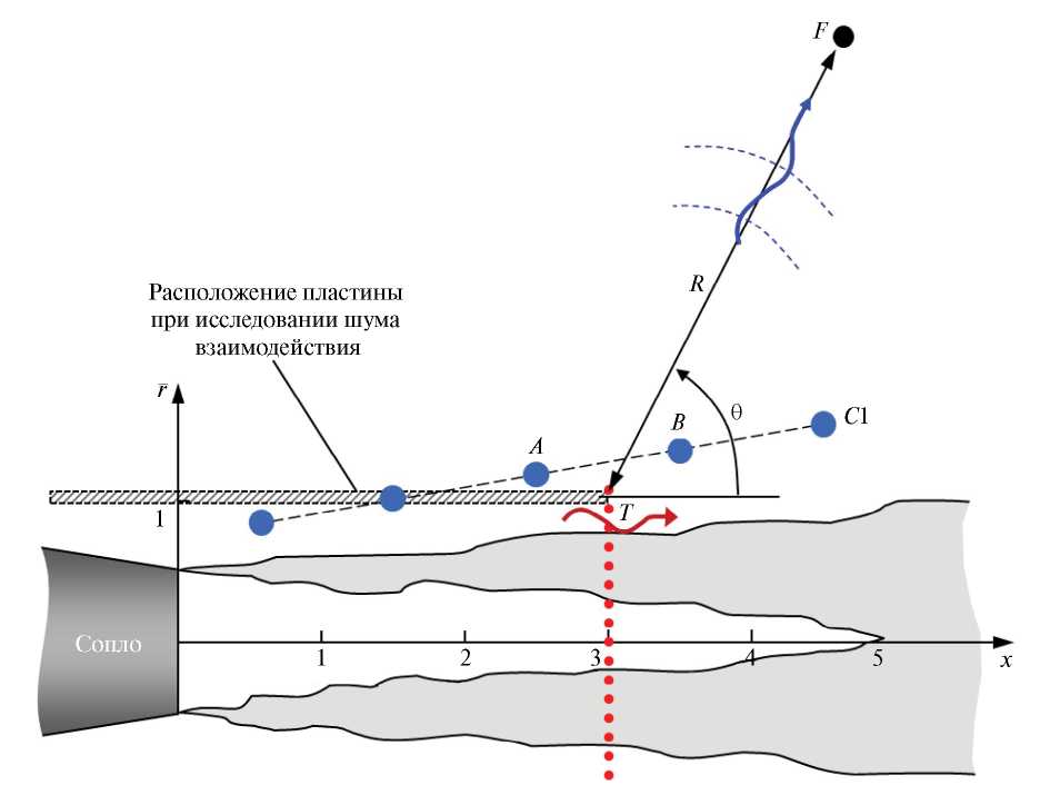 где Mcf = Ucf/c и Mc = Uc/c – числа Маха спутного потока и скорости возмущений ближнего поля соответственно, R – расстояние от кромки до наблюдателя, θ – угол наблюдения (рис. 12).