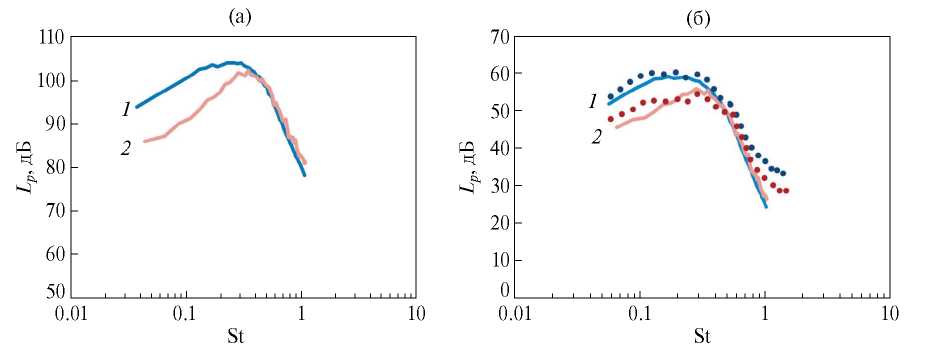 Рис. 13. Спектры пульсаций давления в статических условиях (1) и при наличии спутного потока (2): (а) – в месте расположения задней кромки пластины; (б) – в дальнем поле в точке R = 20D, θ = –90° (точка “под” пластиной), символы – прямые измерения шума взаимодействия в дальнем поле [36], линии – оценка по спектрам ближнего поля.