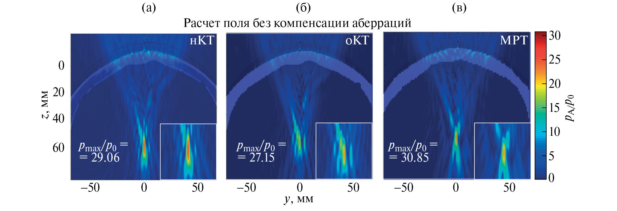 Компенсация аберраций далее рассчитывалась по той же модели, которая в дальнейшем использовалась при облучении. На рис. 7 представлены распределения нормированной амплитуды давления pA/p0 в плоскости zy для всех трех моделей. Надписи вида “нКТ/нКТ” в верхнем правом углу рисунков соответствуют моделям, для которых были проведены коррекция аберраций и расчет поля. По сравнению со случаем облучения без компенсации аберраций (рис. 6) видно, что во всех случаях коррекция позволяет добиться точной фокусировки, избежать образования побочных максимумов и “размытия” фокуса.