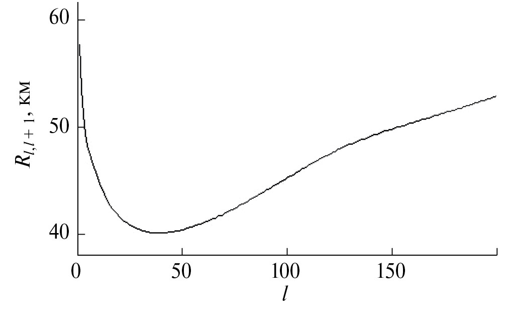 Рис. 2. Зависимость периода интерференции соседних мод Rl,l+1(l) (12) от их номера l при частоте излучения f = 300 Гц.