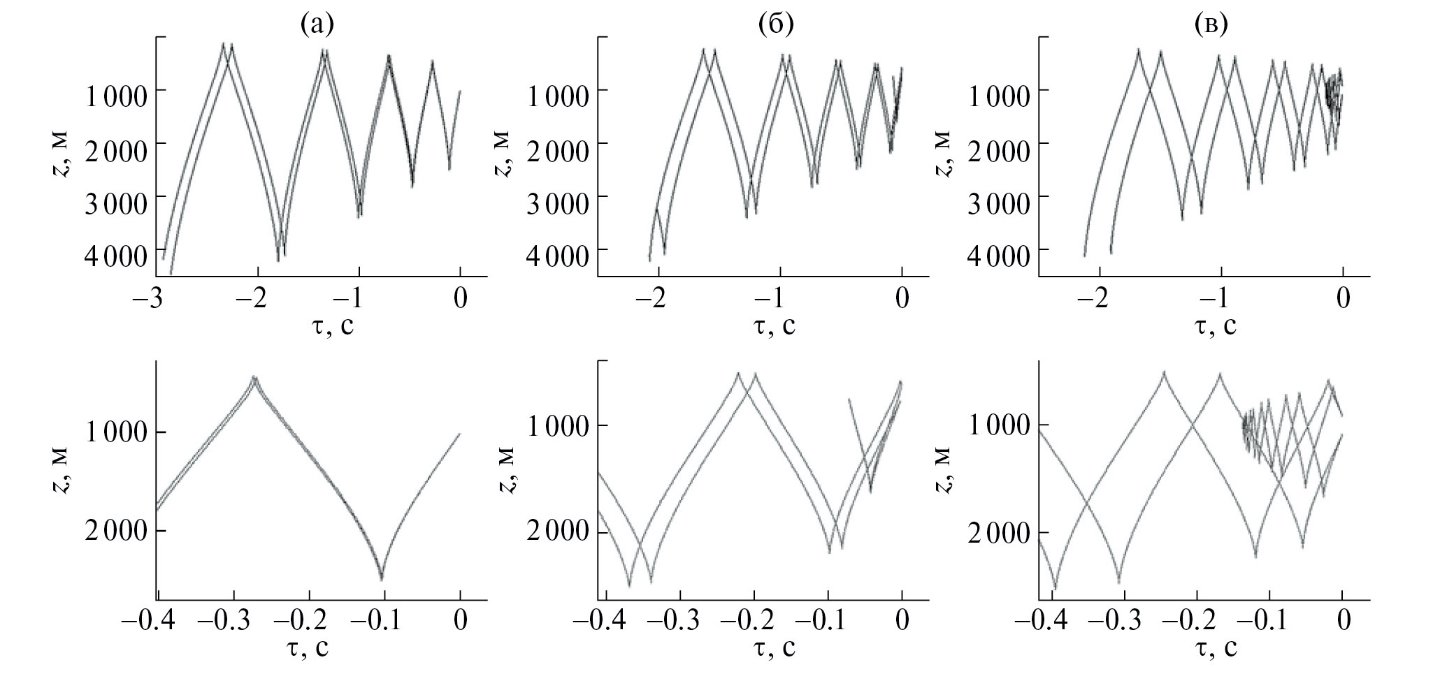 Рис. 7. Зависимость от глубины приема z относительного времени распространения сигналов по лучам τ(z) (17) на горизонтальном расстоянии r = 600 км при фиксированном диапазоне углов выхода лучей –14° ≤ χs≤ +14° из источника, расположенного на различных глубинах zs: (а) – zs = 500 м, (б) – zs = 700 м, (в) – zs = 1000 м. На каждом из рисунков (а), (б) и (в) нижний рисунок соответствует более детальному анализу представляющей интерес заключительной фазы прихода импульсных сигналов.