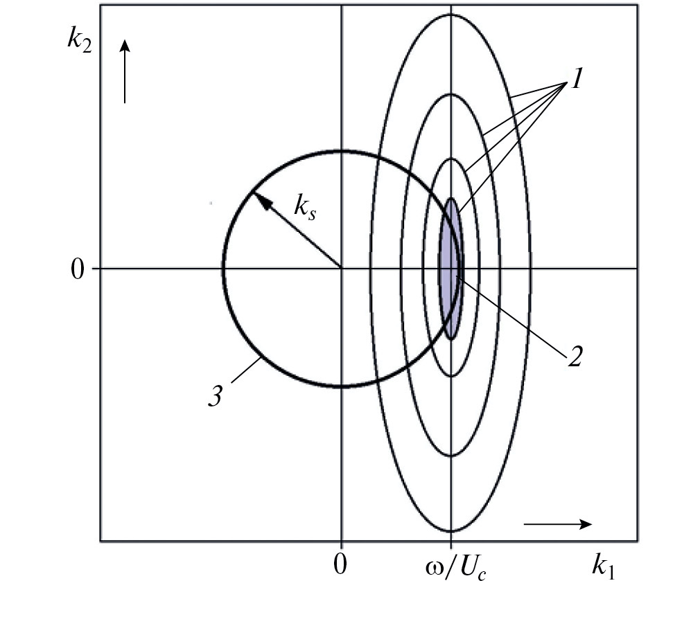 Некоторые универсальные свойства скалярного спектра могут быть получены из анализа графических зависимостей, представляющих (векторный) частотно-волновой спектр турбулентных давлений кривыми равного уровня на плоскости компонент k1 (вдоль направления внешнего потока) и k2 (в перпендикулярном направлении) волнового вектора k. Такое представление получило в настоящее время широкое распространение [1, 4, 8]. При всех заметных конкретных различиях, графики, схематически показанные на рис. 1, имеют очевидные общие свойства.
