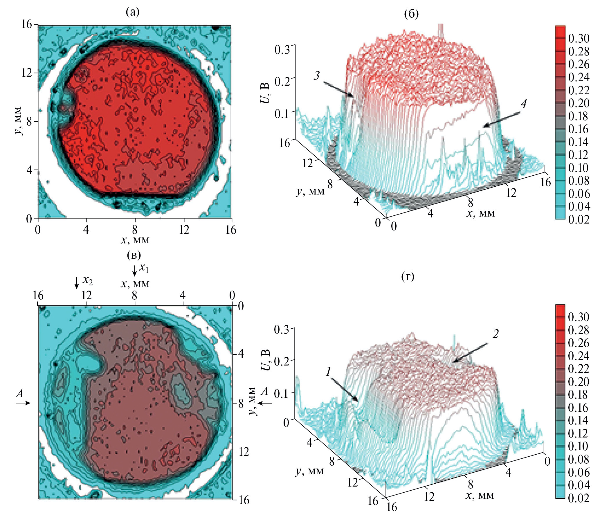 На рис. 2 приведены акустические изображения термодиффузионной сварки для диска А (рис. 2а, 2б) и диска Б (рис. 2в, 2г) в виде изолиний и поверхности в режиме локации на отражение, а на рис. 3 – аналогичные изображения, полученные в режиме локации на просвет. Они позволяют получить полную информацию как об изменении амплитуд принятых акустических сигналов, так и их пространственном распределении.