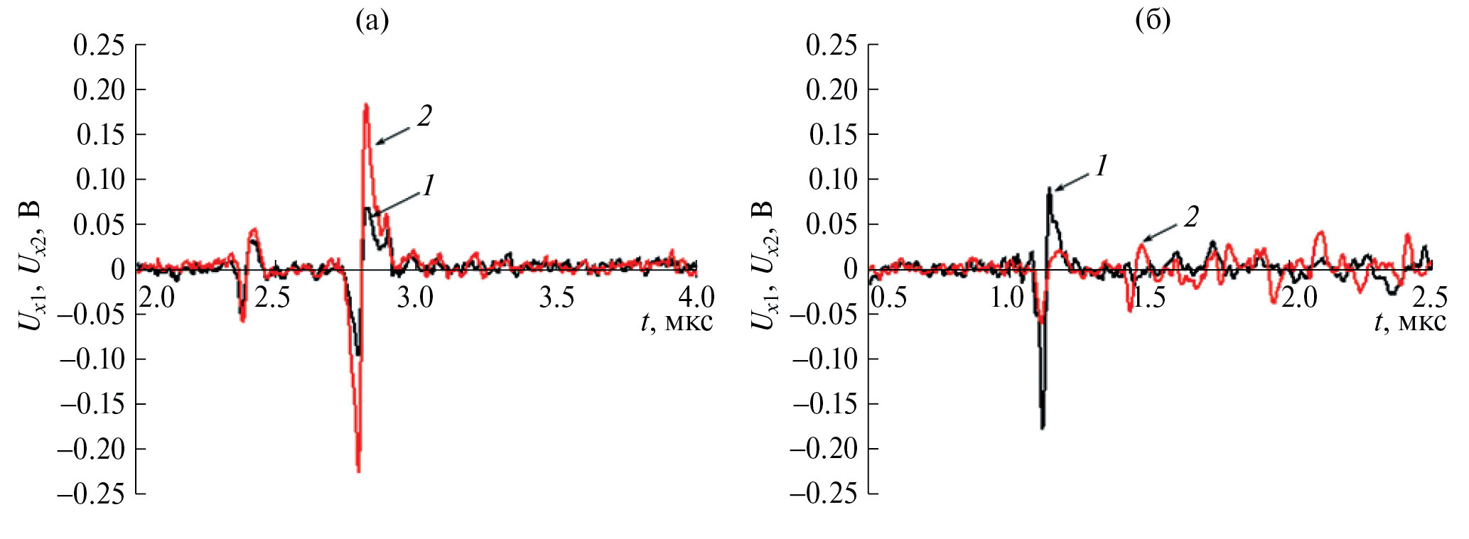 На рис. 4 приведены осциллограммы Ux1(t) и Ux2(t) сигналов в выбранных временных окнах анализа, записанных для сечения А (рис. 2в) в месте его пересечения датчиком с координатами x1 и x2 (для бездефектной и дефектной областей).