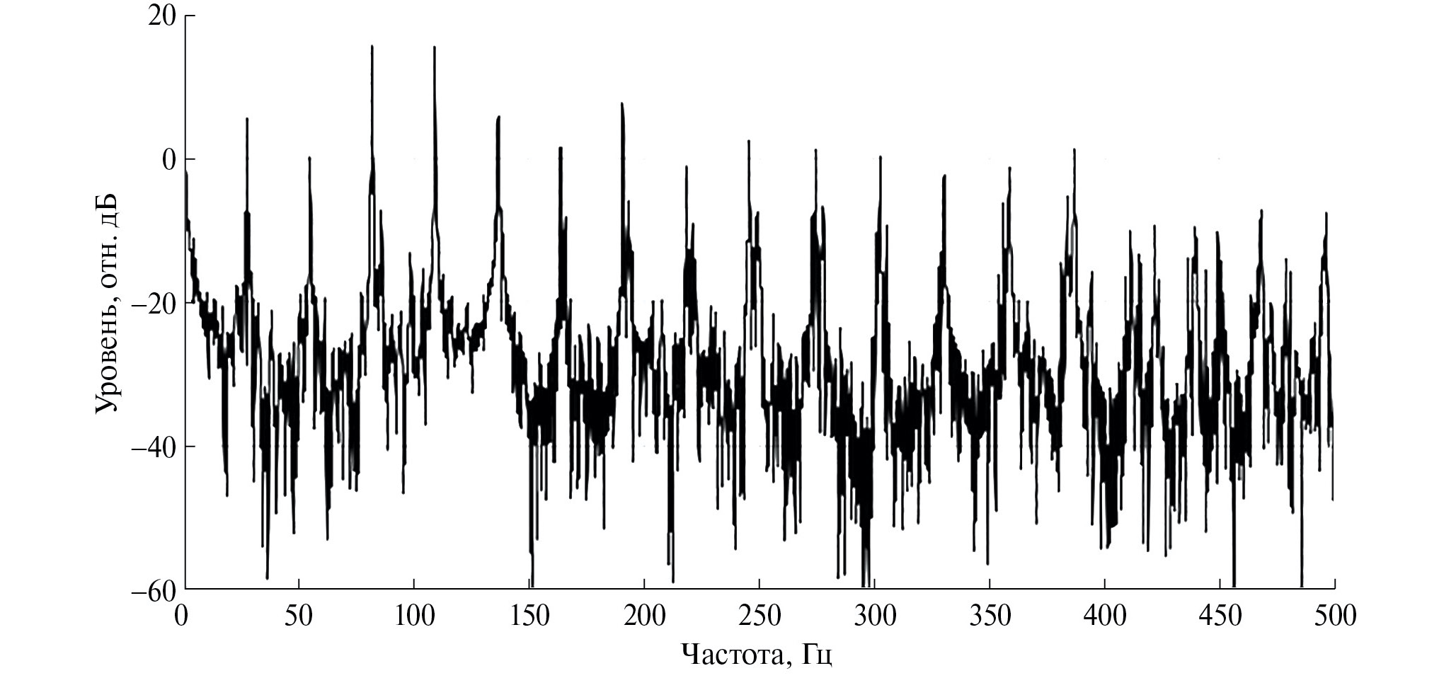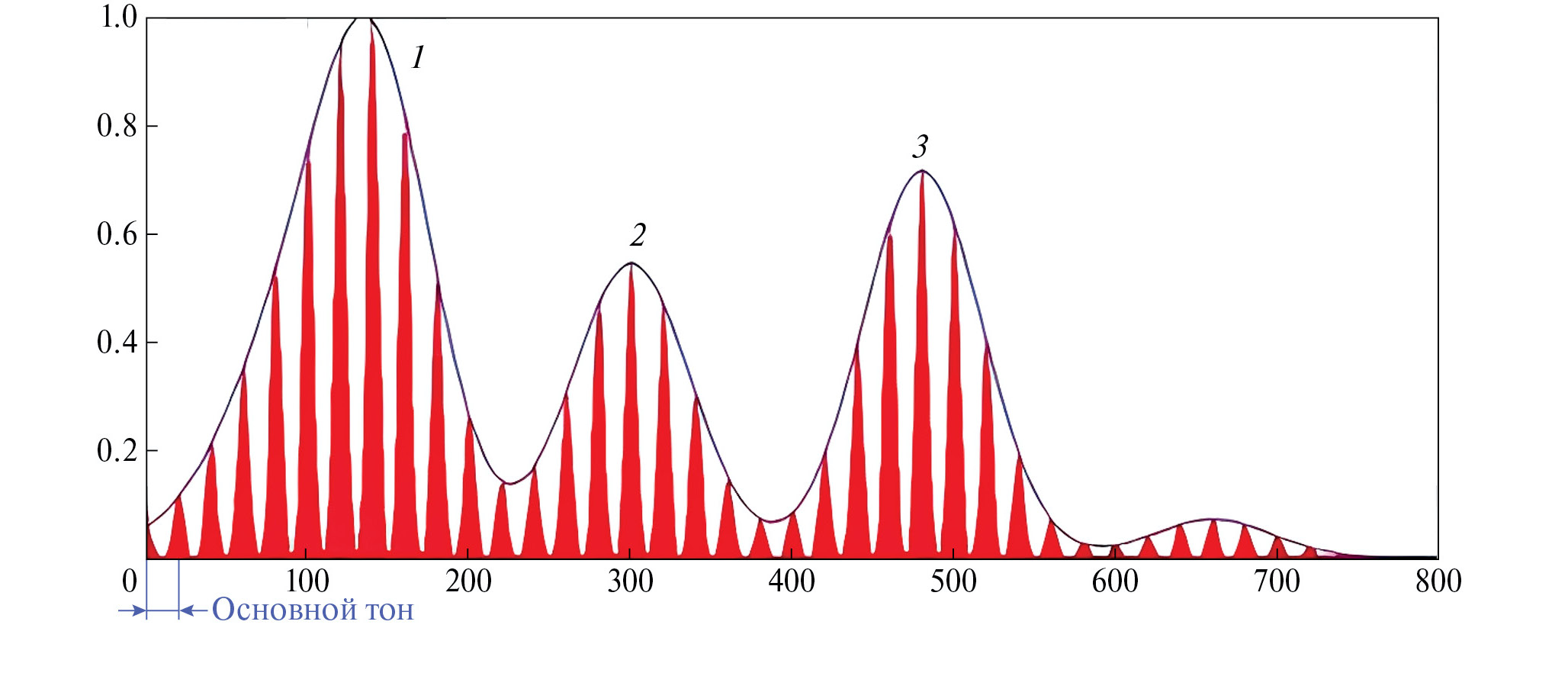 Для примера, на рис. 1 показан спектр звука басовой ноты фортепиано, на рис. 2 (взят из сети Интернет) – спектр речи. Видно, что оба спектра состоят из набора дискретных частот, отвечающих модам основного тона и высшим модам, при этом уровень основной моды мал в сравнении с уровнем высших мод. На рис. 1 основой тон на частоте 27 Гц имеет уровень –9 дБ, в то время как уровень некоторых обертонов превышает 20 дБ, т. е. различие составляет ~30–40 дБ. Отметим, что это не всегда так и зависит от того, какая именно нота озвучена. Спектр звучания ноты может содержать основной тон с гораздо более высоким уровнем, но нет таких нот, основной тон которых заметно превалирует над обертонами. В спектре речи наблюдается качественно та же картина, как это видно по рис. 2.