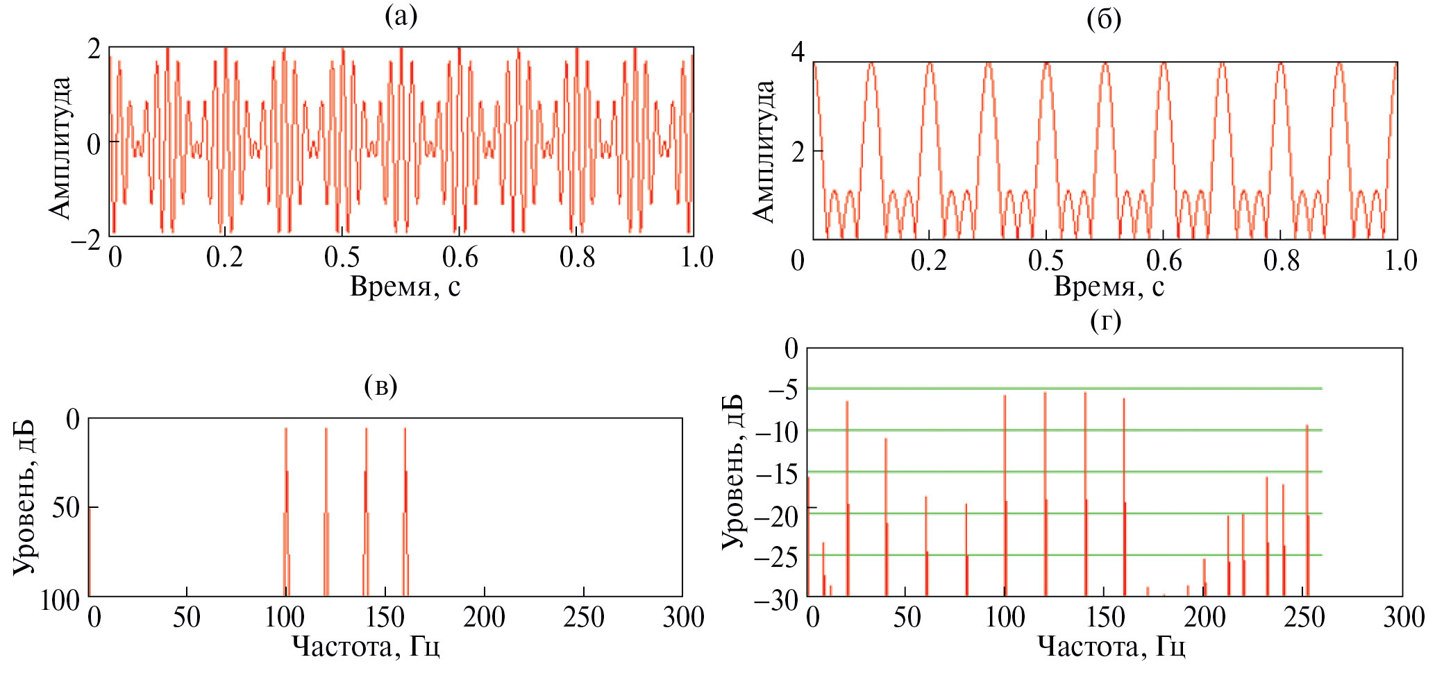 Рис. 4. Интерференция четырех эквидистантных гармоник на частотах 100, 120, 140, 160 Гц: (а) – суммарный сигнал и (б) – его огибающая, (в) – спектр суммарного сигнала, (г) – спектр огибающей.