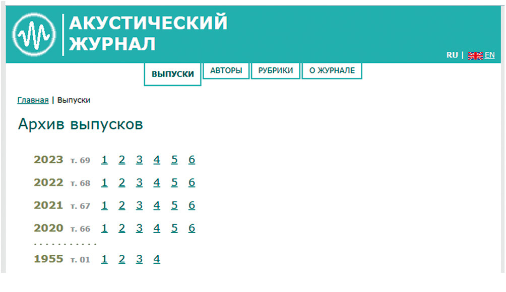 Проект перевода архива “Акустического журнала” в электронный вид и размещения его в открытом доступе в Интернете начал реализовываться в январе 2012 г., а в июне того же года по адресу http://www.akzh.ru был выложен весь архив журнала. На конец 2023 г. уже вышло 378 выпусков с одним приложением, и все они представлены сейчас на сайте Архива “Акустического журнала” (рис. 1).