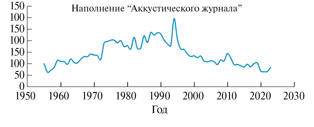 “Акустический журнал” является единственным журналом в русскоязычном мире, где печатаются статьи по всей акустической тематике – как в области теоретической, так и прикладной науки и техники. Журнал сразу же стал настольным для всех учреждений и специалистов акустического профиля, стартовав с тиража в 1800 экземпляров. Приведем на рис. 2 наполнение “Акустического журнала” по годам выпуска.