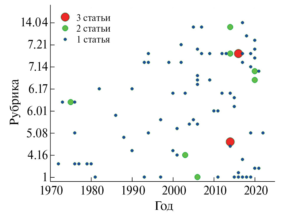 Рис. 3. Поле интересов в области акустики Л.М. Лямшева. (Размеры и цвет кружков соответствуют количеству статей).