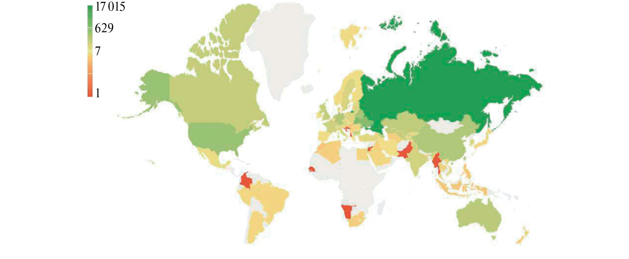 Рис. 7. Активность по посещению сайта “Акустического журнала” в 2021 г. по странам.