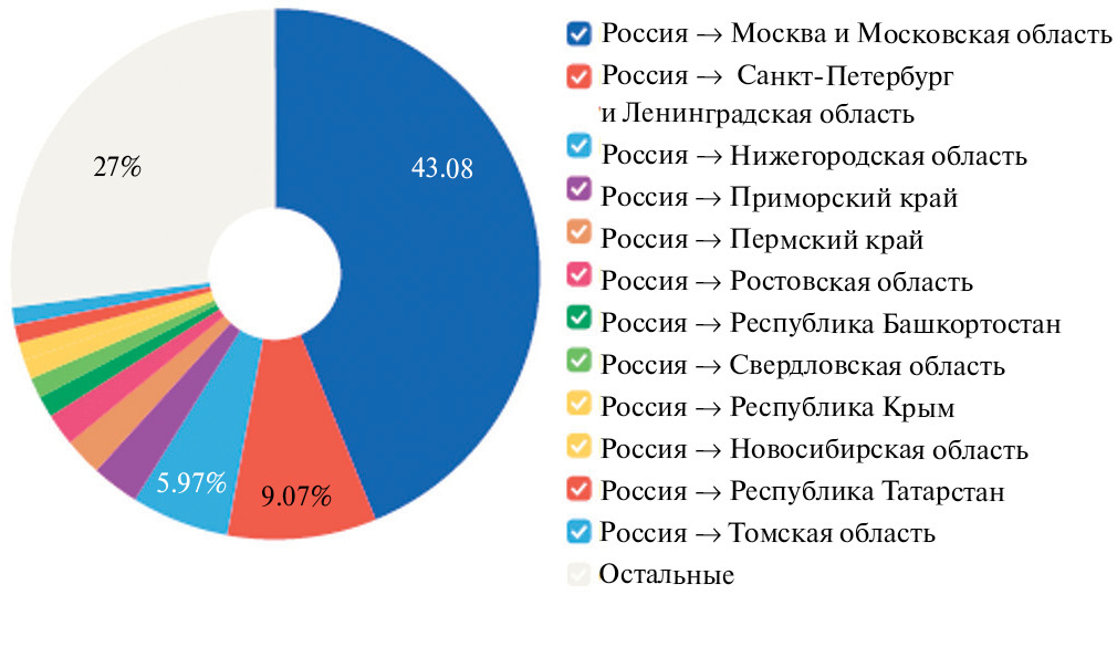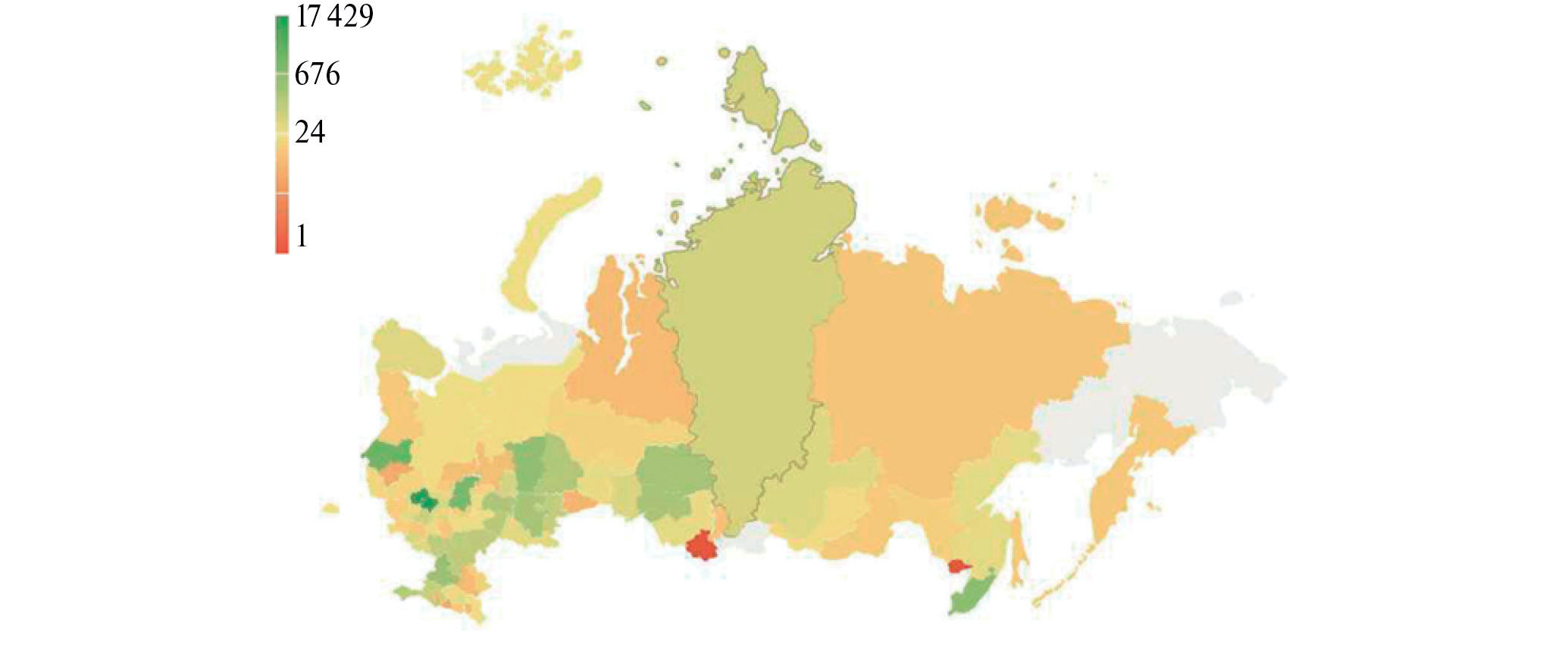 Рис. 8. Количество визитов на сайт архива “Акустического журнала” за 5 лет по административным округам РФ.