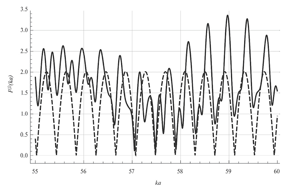 Сравнение результатов вычислений в нескольких точках интервала 55≤ ka ≤ 60 значений функции формы F(ka), полученных с использованием асимптотических выражений (17), (11), (20), (21), и точных значений функции формы, вычисленных по формулам (1)–(3), показало, что во всех этих точках разница между полученными значениями не превосходит 10–5.